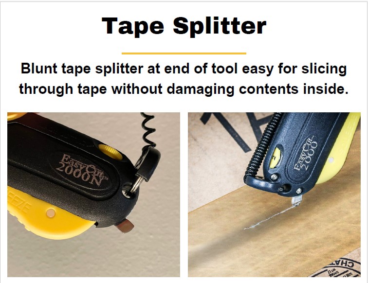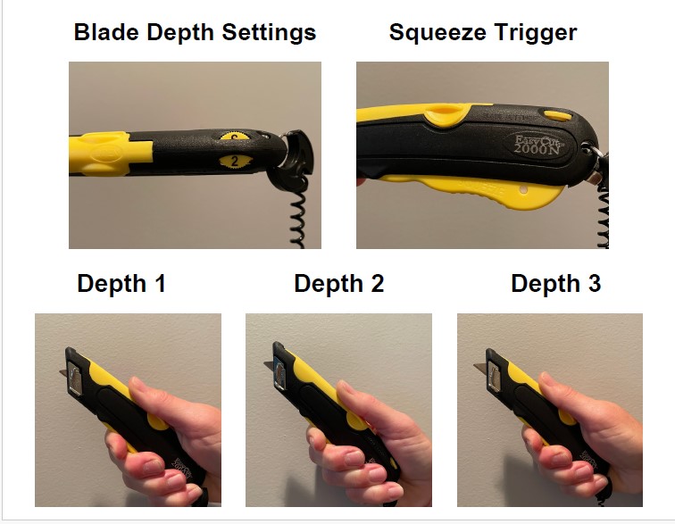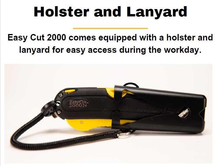 The Easy Cut 2000 Safety Knife features 3 blade depth settings. One for single corrugated box/tape, another for double corrugated box and finally one for utility knife which is the standard blade depth on most utility knives. This knife also features a clip-on holster and lanyard system to prevent lost cutters.